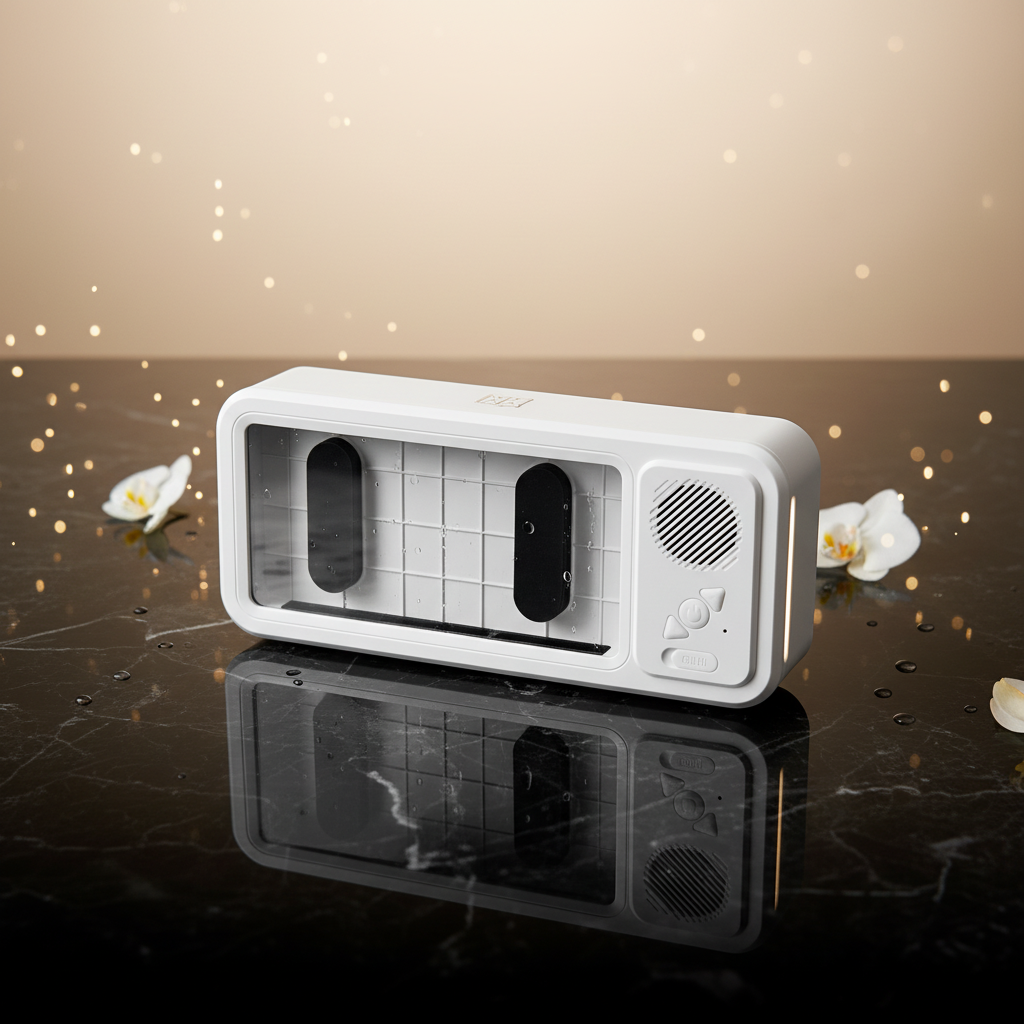 Place AquaWaveBox™ sur la surface propre et sèche de ta salle de bain grâce à sa fixation sans perçage. Ouvre le boîtier, insère ton smartphone et referme la vitre étanche. Connecte-toi via Bluetooth, choisis ta playlist et profite d’un son puissant même sous les éclaboussures. Son écran tactile reste réactif pour naviguer facilement sans sortir ton téléphone de sa protection.